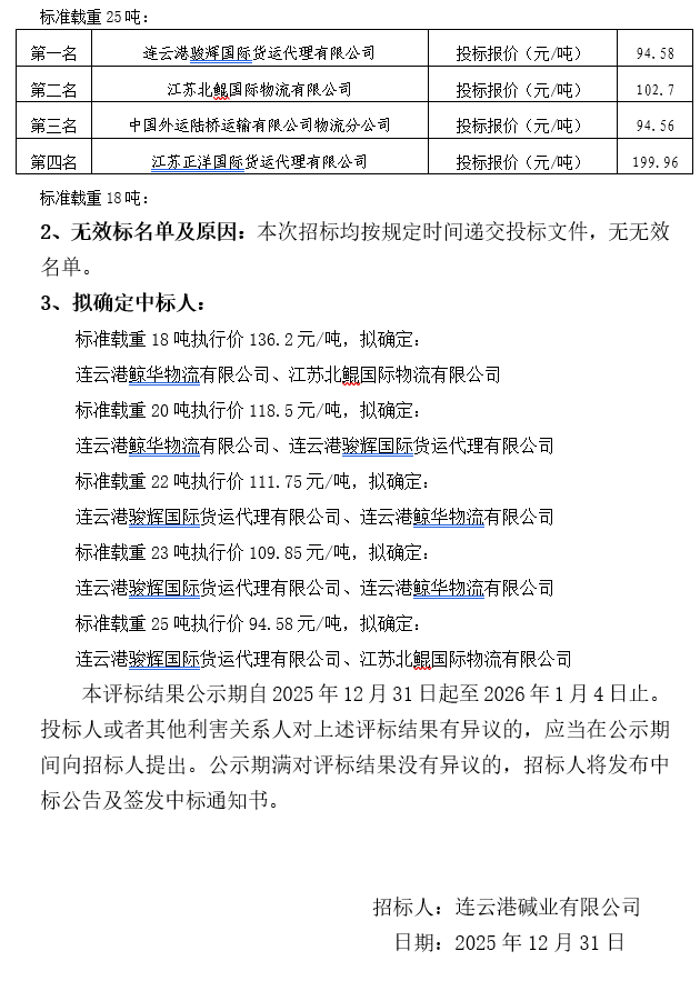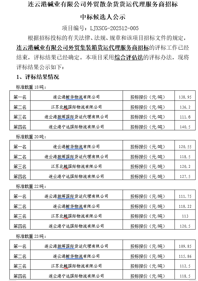 连云港碱业有限公司外贸集装箱货运代理服务商招标中标候选人公示