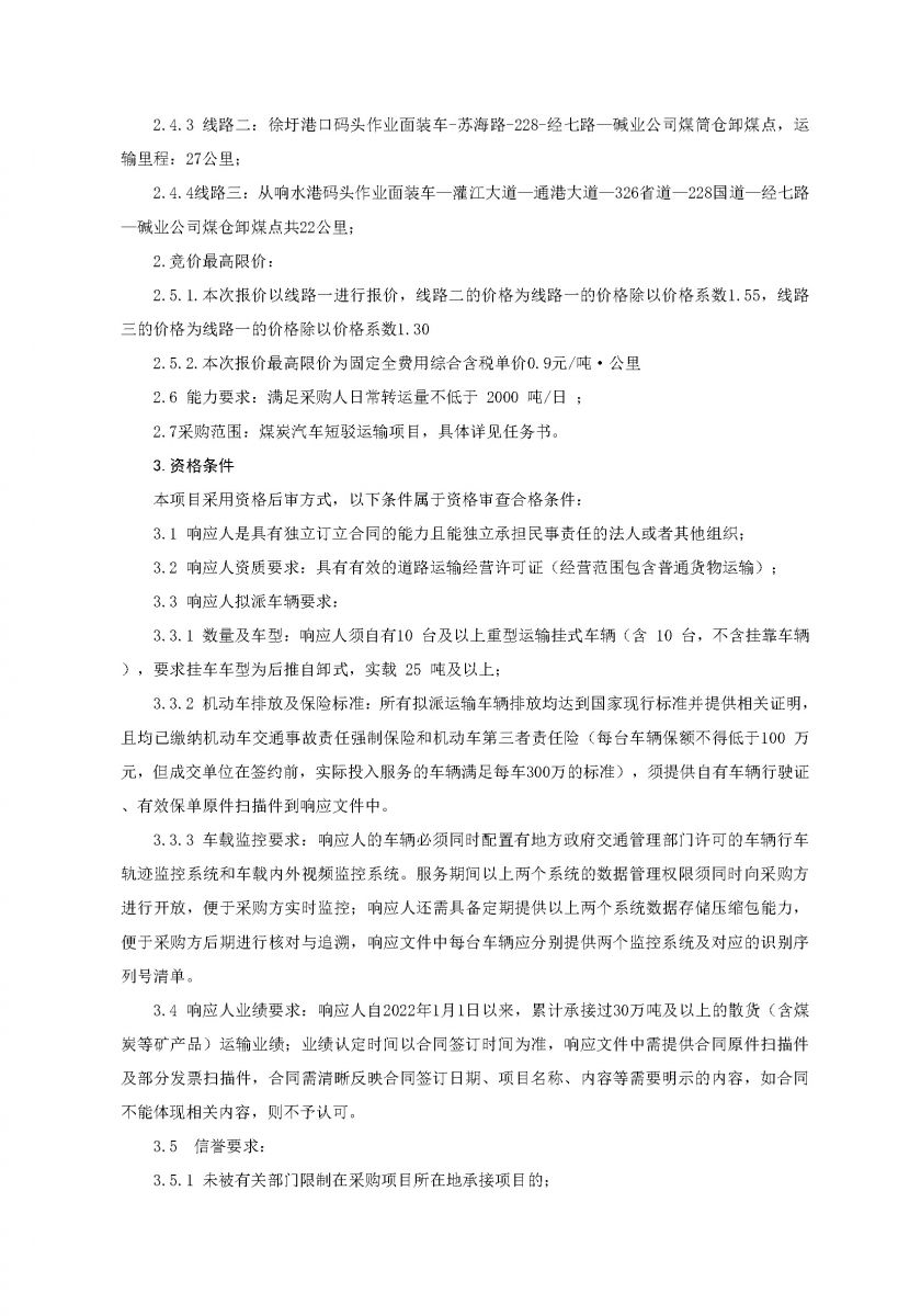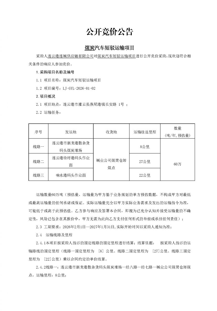连云港连碱供应链有限公司煤炭汽车短驳运输项目公开竞价公告