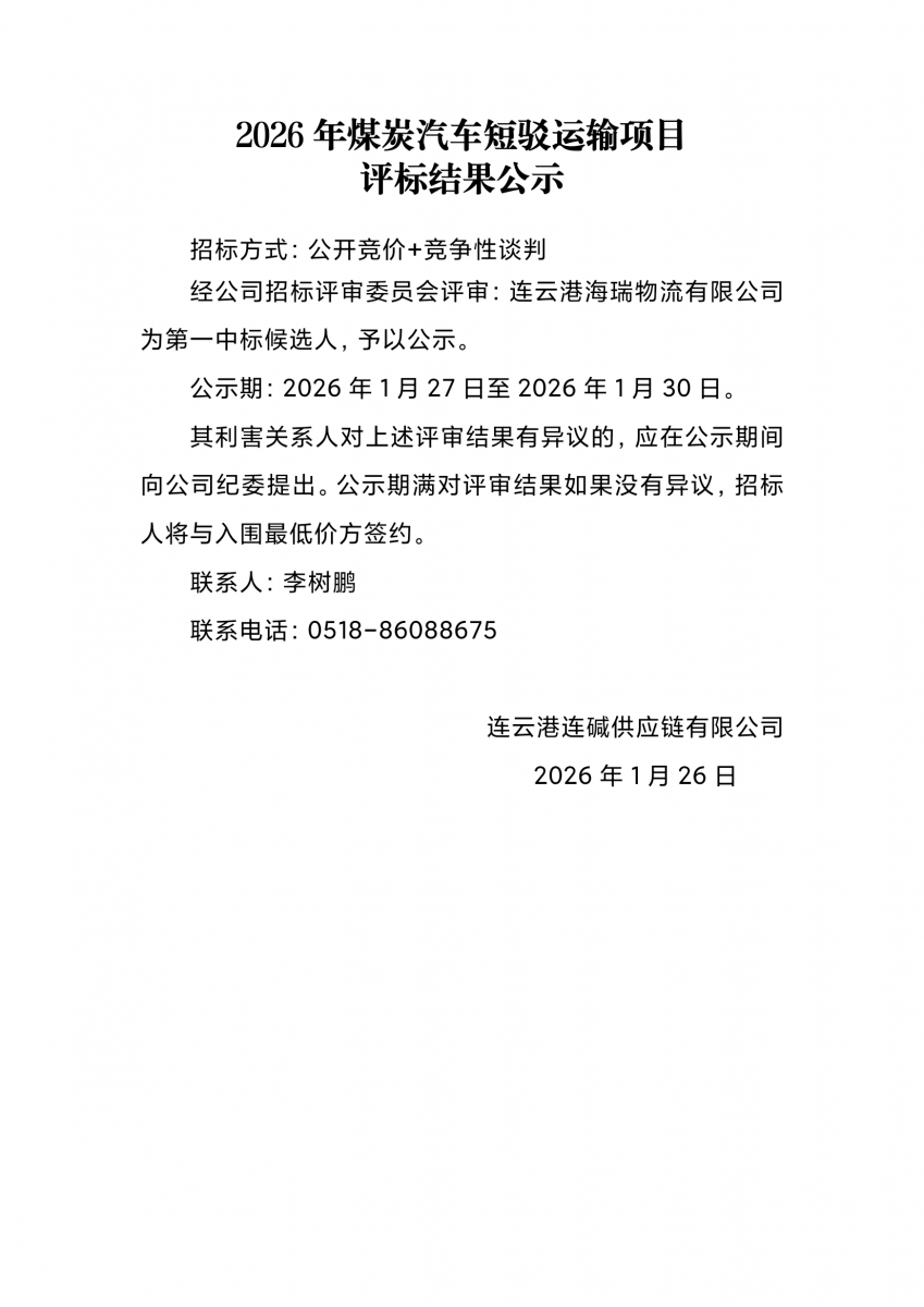 2026年煤炭汽车短驳运输项目评标结果公示