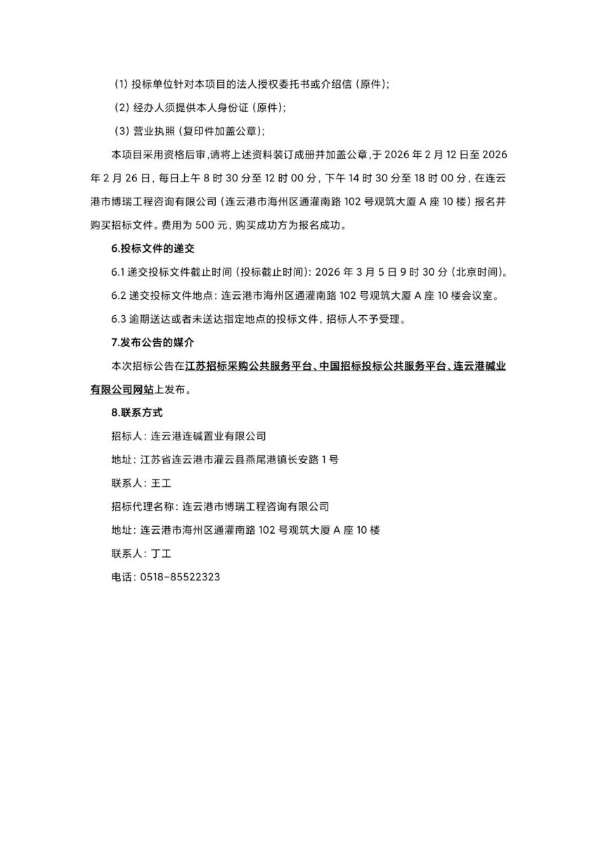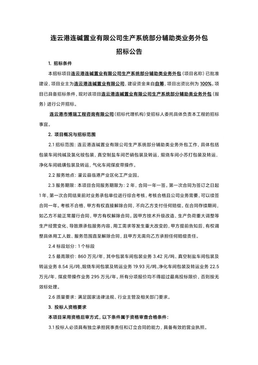 连云港连碱置业有限公司生产系统部分辅助类业务外包招标公告