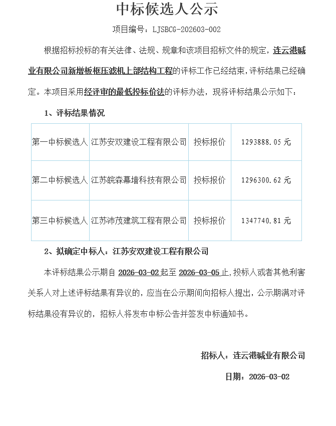 连云港碱业有限公司新增板框压滤机上部结构工程中标候选人公示